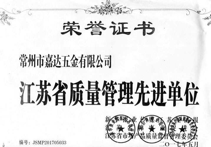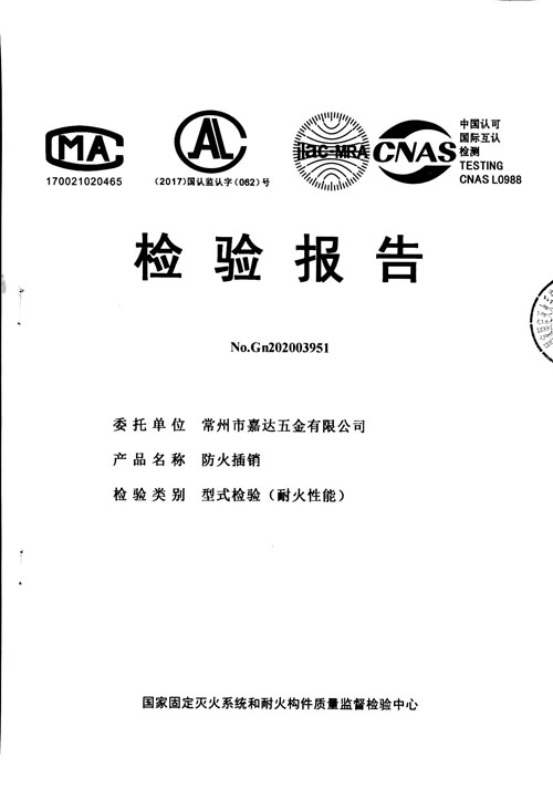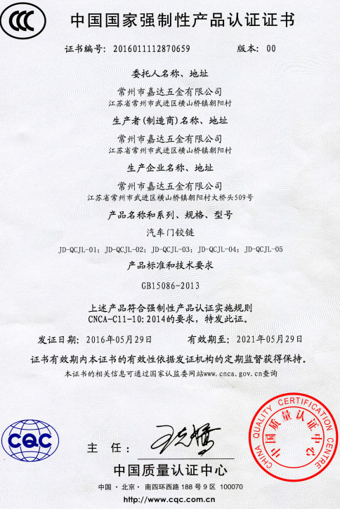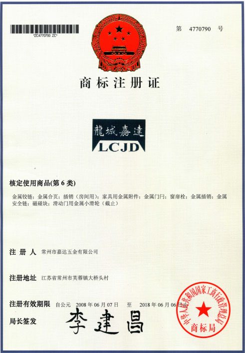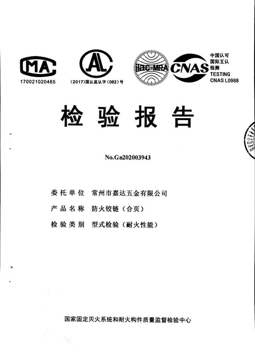 常州市嘉達五金有限公司是專業(yè)生產(chǎn)不銹鋼防火、防盜合頁、銅手拉門、銅門鉸鏈、銅花和各種不銹鋼暗插銷的企業(yè).最近又成功開發(fā)承重鉸鏈以及調(diào)節(jié)門縫可調(diào)式鉸鏈.同時引進澳大利亞技術(shù)開發(fā)各種鋁合金透氣百頁窗,遠(yuǎn)銷歐美市場. 我司占地面積25000平方米,建筑面積12000平方米;固定資產(chǎn)1200萬元,公司設(shè)備齊全,設(shè)計獨特,檢測一流,產(chǎn)品適用于高級防火門以及現(xiàn)代高層居室、艦船門的配套,也適應(yīng)于一般居民.產(chǎn)品經(jīng)"天津國家固定滅火系列和耐火構(gòu)件質(zhì)量監(jiān)督檢驗中心"檢驗合格. 公司重視產(chǎn)品質(zhì)量,重視產(chǎn)品開發(fā)創(chuàng)新.目前已建立完整的質(zhì)量管理體系:通過ISO9001:2000質(zhì)量認(rèn)證體系和中國強制認(rèn)證3C認(rèn)證.產(chǎn)品曾獲國家知識產(chǎn)權(quán)局"中國專利技術(shù)博覽會"金獎、獲得"企業(yè)資信等級AAA級"、"信用(合同)AAA級企業(yè)"、"中國檢驗協(xié)會會員"、"中國電器照明協(xié)會委員"、"中國工商協(xié)會委員"、"首批國家質(zhì)量服務(wù)信得過單位"、"常州市文明單位"及"武進區(qū)文明單位"的稱號. 公司的經(jīng)營宗旨是"以顧客為中心、以質(zhì)量為市場、以創(chuàng)新求發(fā)展、以管理求效益". 公司將一如既往,以一流的產(chǎn)品質(zhì)量,誠心周到的服務(wù)使顧客滿意,以更好的服務(wù)于客戶.