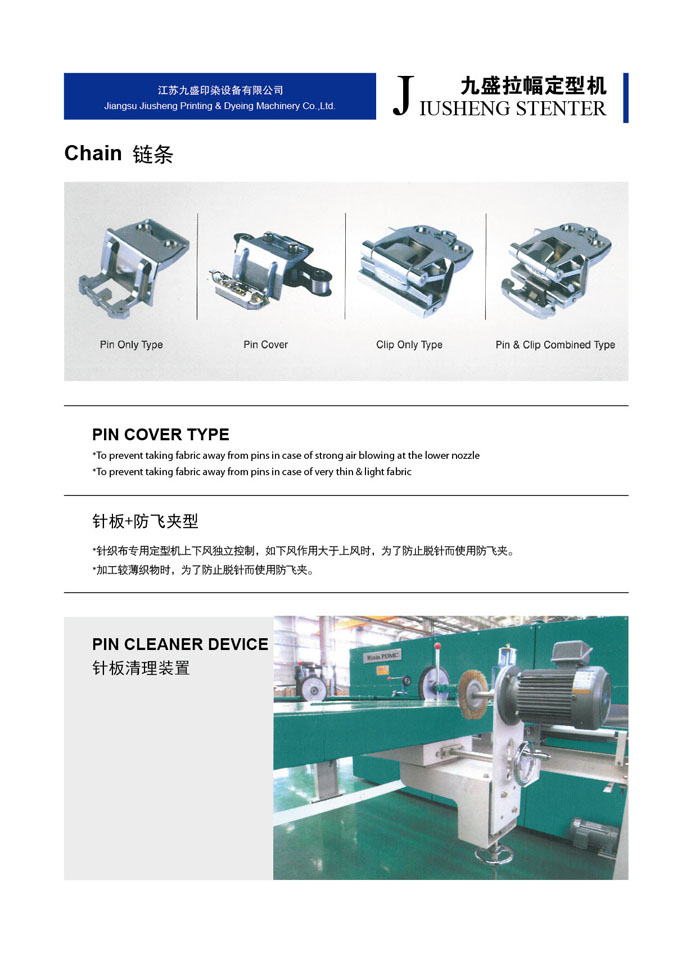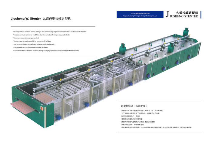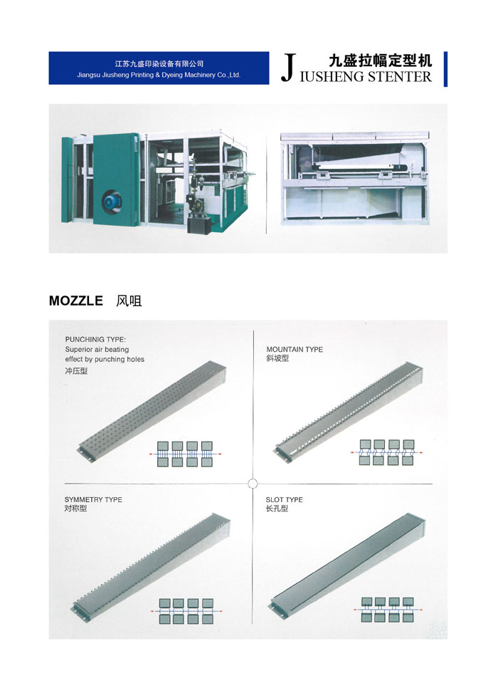 江蘇九盛印染設(shè)備有限公司(原江蘇鵬輝印染機(jī)械有限公司)創(chuàng)建于1986年,北長(zhǎng)江,所在地區(qū)內(nèi)鐵路、高等級(jí)公路縱橫成網(wǎng),常州長(zhǎng)江公路大橋飛架大江南北,水陸交通十分便利。公司有近二十年的熱定型機(jī)設(shè)計(jì)、生產(chǎn)經(jīng)驗(yàn)、有批從事新型熱定機(jī)開(kāi)發(fā)、設(shè)計(jì)的專(zhuān)業(yè)人才,具有豐富生產(chǎn)和制作經(jīng)驗(yàn)的技師和技工。已成為國(guó)內(nèi)頗具名聲的機(jī)械制作企業(yè)。 樹(shù)脂定型是染整工程最后的程序,因此定型機(jī)的設(shè)計(jì)及操作技術(shù)成為決定織物品質(zhì)重要的一環(huán),九盛公司多年的經(jīng)驗(yàn)改良完成新生代定型機(jī),針對(duì)業(yè)者需要對(duì)于節(jié)省人力布匹張力的減少、緯紗的調(diào)整,風(fēng)量的調(diào)節(jié),布邊控制及切邊損耗及至于熱能保持,維修工作,操作管理都有卓越表現(xiàn)及實(shí)際成果,而機(jī)械的研制及生產(chǎn)技術(shù)的發(fā)展是本公司創(chuàng)立的目標(biāo)和宗旨。