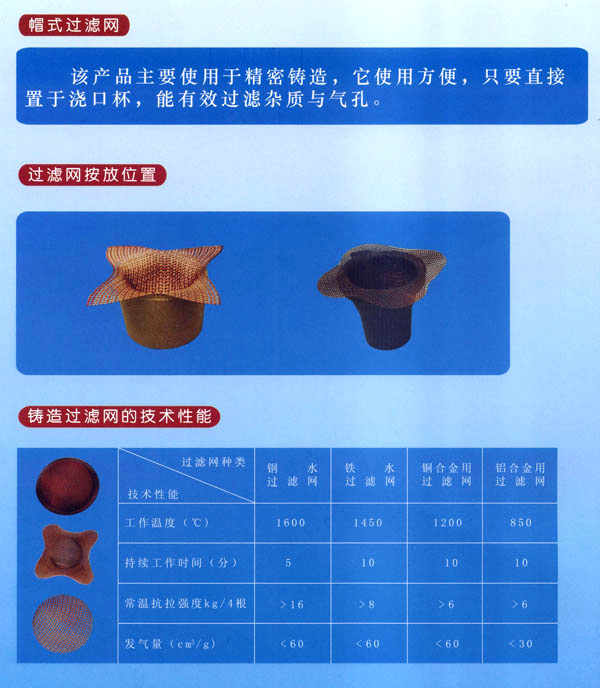 常州市猛將過濾網(wǎng)有限公司是專業(yè)生產(chǎn)系列鑄造過濾網(wǎng)的廠家。主要產(chǎn)品有:鐵水過濾網(wǎng)、鋼水過濾網(wǎng)、銅水過濾網(wǎng)、鋁水過濾網(wǎng)及熔模用帽式過濾網(wǎng)等。本廠產(chǎn)品是哈工大科研成果,榮獲國家經(jīng)委頒發(fā)的新技術(shù)成果獎。航天部科技進步一等獎;中國質(zhì)量檢驗協(xié)會授予“猛將”牌高硅氧過濾網(wǎng)“國家權(quán)威檢測達標(biāo)產(chǎn)品”榮譽證書;我廠生產(chǎn)的“四角帽式過濾網(wǎng)”獲國家專利局外觀設(shè)計專利證書;并獲香港國際新技術(shù)新產(chǎn)品博覽會“金獎證書”。2002年獲亞洲國際新技術(shù)新產(chǎn)品博覽會“科技發(fā)明進步獎”,2002年本廠所生產(chǎn)的“四角帽式過濾網(wǎng)在首屆“金艦杯”國際新技術(shù)成果網(wǎng)絡(luò)交易會活動中成績顯著,被評為金杯獎。同年在日內(nèi)瓦國際專利技術(shù)成果博覽會中被評為國際優(yōu)秀專利金獎。目前,本廠產(chǎn)品銷往全國各省、市、自治區(qū),是國內(nèi)銷量最大的廠家之一。同時出口韓國、泰國、東南亞等國家。進入21世紀(jì)以來,我國加入WTO后,我廠在哈工大葉榮茂教授的指導(dǎo)下,開發(fā)研制出一種多孔泡沫陶瓷過濾網(wǎng),該產(chǎn)品兼具玻璃纖維過濾網(wǎng)和直孔過濾網(wǎng)的篩分夾渣功能,且更具有吸附微小夾渣氧化物的功能。多孔泡沫陶瓷過濾網(wǎng)的主要工作原理是讓紊亂、翻騰的(TV urbuItnt Flow)金屬液經(jīng)過產(chǎn)品形成平穩(wěn)、均勻(SmoothFlow)的金屬液,金屬液經(jīng)過復(fù)雜的多孔泡沫陶瓷過濾網(wǎng),能有效地吸附截留微小氧化夾渣物,并溢除氣泡,然后能使鑄件產(chǎn)品達到純潔度高、強度高、韌性好、機械加工性能好等特點,從而能夠降低生產(chǎn)成本,提高產(chǎn)品成品率,增加經(jīng)濟效益。我廠熱忱歡迎廣大用戶使用該產(chǎn)品。 我公司設(shè)計發(fā)明的“四角帽式過濾網(wǎng)”,已在2001年3月申請專利,并于當(dāng)年11月底經(jīng)中華人民共和國知識產(chǎn)權(quán)局授權(quán)公告。頒布了外觀設(shè)計專利證書,證書號第207620號,F(xiàn)有個別廠家悍然侵權(quán),公然在有關(guān)鑄造媒體打出侵權(quán)產(chǎn)品廣告。對此,我們鄭重聲明,要求侵權(quán)廠家盡快采取糾正措施,為了維護我們的知識產(chǎn)權(quán),我們不排除采取法律行動的可能。