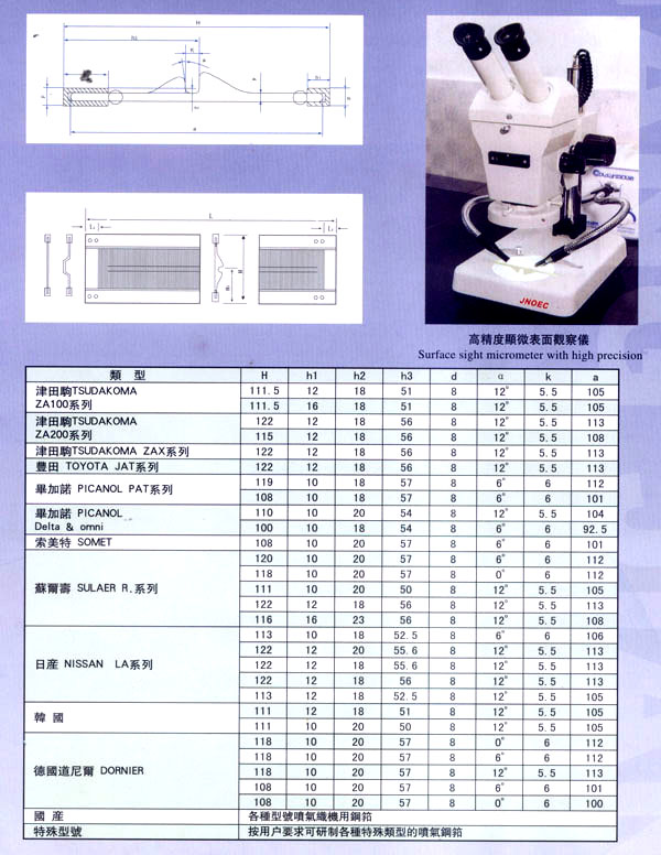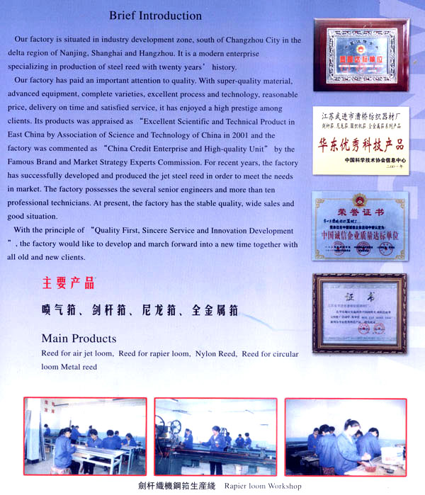漕橋紡織器材廠位于常州市南郊寧、滬、杭金三角漕橋工業(yè)開發(fā)區(qū),是全國專業(yè)生產(chǎn)鋼筘規(guī)模較大的現(xiàn)代化廠家,已具有20年的歷史。 本廠生產(chǎn)的鋼筘有噴氣、劍桿筘、尼龍筘、圓織機筘和金屬筘分鉸筘、織帶筘、無梭織帶筘……本廠特別擅長生產(chǎn)高密度的劍桿筘。 本廠素以質(zhì)量為重,均采用優(yōu)質(zhì)材料制筘,如噴氣筘使用的筘片膠水鋁架等,均采用日本進口的材料;劍桿筘筘片采用日本進口的57B線材,膠水均采用紡織部定點的陜西紡織研究所生產(chǎn)的優(yōu)質(zhì)膠水、高密度劍桿筘均用進口膠水制筘;全金屬筘均用云南的優(yōu)質(zhì)錫制筘。 各種鋼筘筘面的平整度,筘齒的均勻度、垂直度,筘片的彈性度,膠水的牢固度廣大用戶使用后感到滿意放心,特別是使用壽命特別長,受到用戶一致的盛贊,真是料好筘好,筘好布好。 本廠為了使質(zhì)量精益求精,增添了不少先進設(shè)備,并聘請了數(shù)名高級工程師和十多位具有專業(yè)知識的技術(shù)人員把關(guān)。由于質(zhì)量穩(wěn)定可靠,2001年被中國科學技術(shù)協(xié)會評為“華東優(yōu)秀科技產(chǎn)品”二00二年被中國管理科學研究院名牌與市場戰(zhàn)略專家委員會評為“中國誠信企業(yè)質(zhì)量達標單位”。 今本廠產(chǎn)品暢銷全國20多個省市,價格優(yōu)惠,供不應(yīng)求,形勢喜人。 本廠本著“以質(zhì)取勝、誠信服務(wù)、創(chuàng)新發(fā)展”的宗旨,愿與廣大新老客戶攜手共肩,昂首走進新時代,迎接新的挑戰(zhàn)。