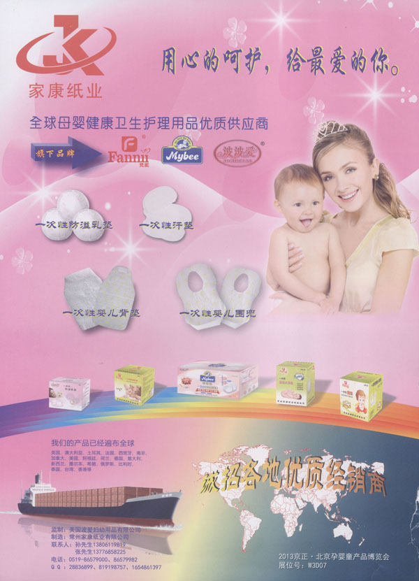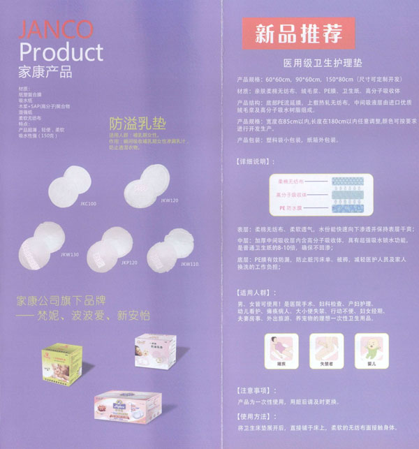 中國(JANCO)家康衛(wèi)生用品公司成立于2004年,我們專注于研發(fā)、設計、及制造健康的衛(wèi)生用品。我們的產(chǎn)品包括防溢乳墊、汗墊、寶寶背墊、圍兜、護理墊等。我們的生產(chǎn)廠房建設在中國江蘇省常州市,這是一個非常美麗的城市,并且我們的廠區(qū)鄰近沿江高速,交通非常便利。 我們擁有國際一流的生產(chǎn)設備、先進的檢測儀器、無菌的生產(chǎn)車間。我們每一個產(chǎn)品都經(jīng)過家康人專心、專業(yè)的制造,我們注重每一個細節(jié),不斷的研發(fā)更舒適、更健康、更人性化的產(chǎn)品,旨在為您提供更滿意的服務。我們也可以根據(jù)您的需求研發(fā)、設計、生產(chǎn)不同的產(chǎn)品。我們的產(chǎn)品已遠銷海外,并且得到非常好的評價。出口的國家有美國、加拿大、英國、意大利、俄羅斯、南非、泰國等。人性化的設計、優(yōu)秀的品質(zhì)、完善的售前、售后服務及合理的價格使我們的客戶與我們的合作感到非常的愉快。 我們已經(jīng)通過了ISO9000和FDA認證,我們將感到非常榮幸能夠與您合作。 我們非常樂意與中國的經(jīng)銷商共同分享我們的產(chǎn)品,我們將非常期待您的信任和加盟。 我們將一如既往的為您提供:更舒適的、更健康的產(chǎn)品。