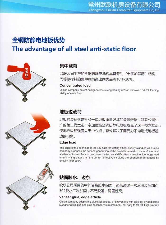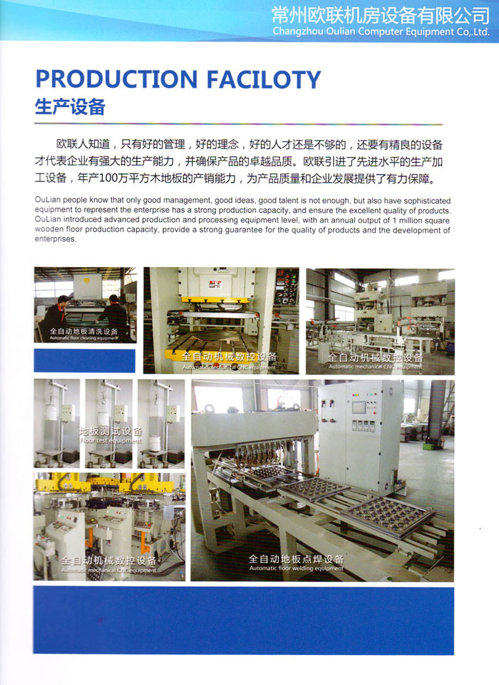 防靜電高架活動(dòng)地板、全鋼地板、陶瓷地板是計(jì)算機(jī)行業(yè)發(fā)展起來(lái)的新型鋪地材料,隔離了潮氣、靜電灰塵,最重要的是解決了綜合布線問(wèn)題,無(wú)需預(yù)埋管線,可隨時(shí)拆卸、搬移,保證了資訊設(shè)備完整的優(yōu)點(diǎn),適應(yīng)了智能化樓宇中信息自動(dòng)化技術(shù)對(duì)所處環(huán)境的特定要求,避免了廣大客戶的雙重投資,使現(xiàn)代化辦公程度更加高效,辦公場(chǎng)所更加舒適。 “歐聯(lián)”系列全鋼地板,符合國(guó)家安全要求,種類完備多樣,其中防靜電陶瓷地板、硫酸鈣地板等除具有普通瓷質(zhì)的裝飾和實(shí)用性外,其耐磨、防水、防火功能優(yōu)于其它同類產(chǎn)品,防靜電系列地板,能切合不同客戶的要求,其靈活的配置,深受客戶歡迎,不同材質(zhì)的地板結(jié)構(gòu)使設(shè)計(jì)師的設(shè)計(jì)空間比傳統(tǒng)的更加廣闊自由和善變。 公司大力發(fā)展國(guó)內(nèi)外銷售業(yè)務(wù),多次中標(biāo)國(guó)內(nèi)重點(diǎn)工程 ,例:哈爾濱醫(yī)科大學(xué)、山東大學(xué)、上海普通機(jī)場(chǎng)等。 公司將一如既往開(kāi)發(fā)和制造一流的產(chǎn)品,愿與廣大有識(shí)之士合作發(fā)展,共創(chuàng)美好未來(lái)。