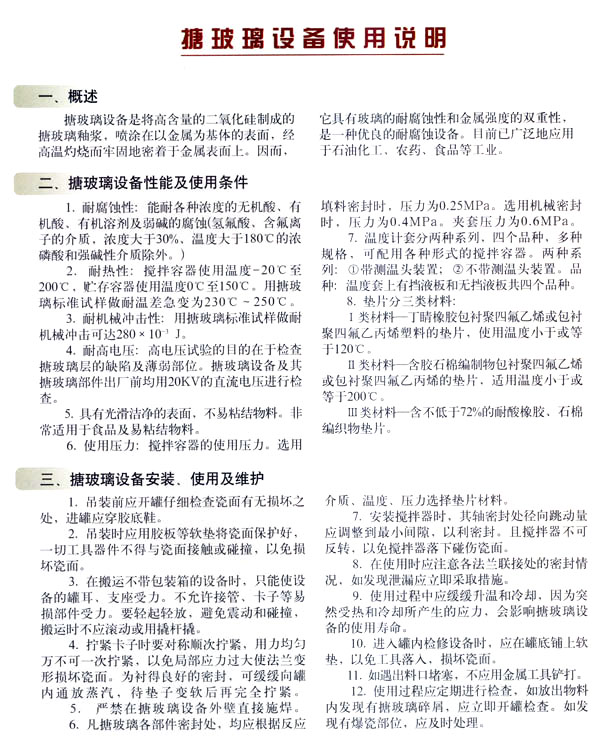 常州利景搪玻璃設備有限公司系化工部定點生產搪玻璃設備的廠家。經過二十余年的探索與發(fā)展公司年生產能力達2000余噸,工裝設備檢測手段齊全,產品質量符合國家和行業(yè)標準,行銷全國各地,并出口新加坡、臺灣、印度、韓國等國家和地區(qū),深受用戶歡迎。 .