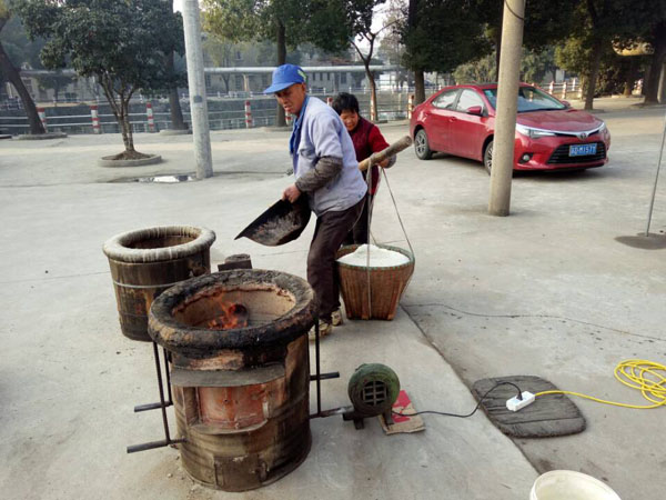 第一步:蒸糯米飯,老徐先用煤爐將水燒開(kāi),再將洗凈泡好的糯米放入一只大木桶中,放在爐子上蒸。除此以外,老徐還要不斷攪拌,保證糯米受熱均勻,直至散發(fā)出水蒸氣。為了保證米飯溫度,老徐特地用塑料薄膜將木桶封住,并用皮筋加固。蒸糯米飯,大約需要半個(gè)多小時(shí)。