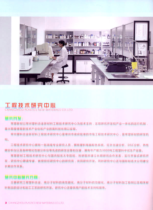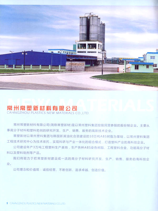 常州常塑新材料有限公司(原名常州塑料集團新材料有限公司)是一家民營股份制企業(yè)。主要從事高分子材料和塑料助劑的研究開發(fā)、生產、銷售、服務。 常塑新材料以常州塑料集團與韓國新湖油化合資建設的10萬噸ABS樹脂為基礎,和與德國吉瑪公司合資建設的20萬噸PET樹脂。以常州塑料集團工程技術研究中心為技術依托,實現(xiàn)科研與產業(yè)一體化的組合模式。 公司建設年產3萬噸工程塑料生產基地,生產各種阻燃ABS、耐熱ABS樹脂、工程塑料合金、功能高分子材料以及塑料助劑等產品。 公司目標:把常塑新材料建設成一流的高分子材料研究開發(fā)、生產、銷售、服務的高科技企業(yè)。 公司理念和價值觀:誠信經營、不斷創(chuàng)新、追求卓越、創(chuàng)造價值。 公司旨在創(chuàng)造以人為本不斷創(chuàng)新的企業(yè)可持續(xù)發(fā)展的核心競爭力,為社會創(chuàng)造價值。