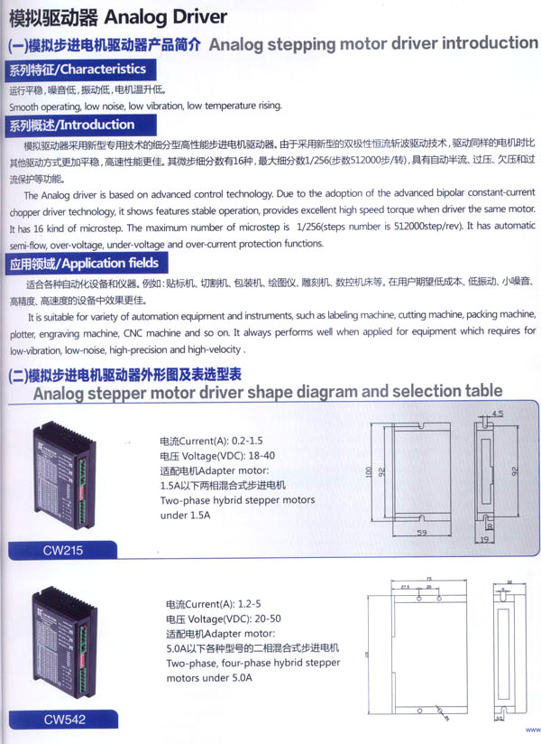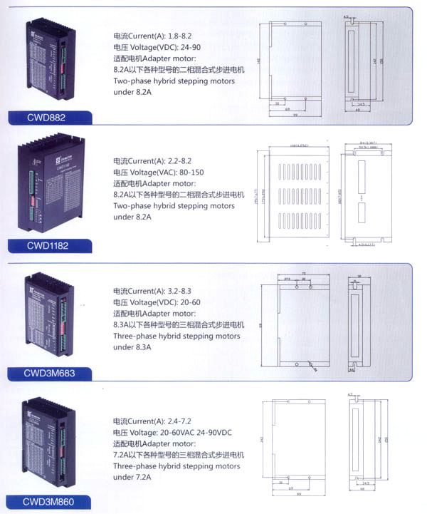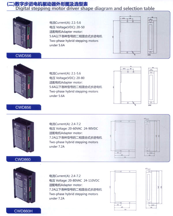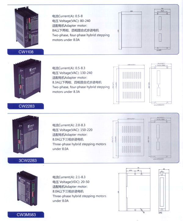 我公司的主要產(chǎn)品有20BH系列、28BH系列、35BH系列、39BH系列、42BH系列、42BHH系列、57BH圓形系列、57BHH方形系列、60BHH方形系列、86BH圓形系列、86BHH方形系列,以及110BHH系列的四相(二相)混合式步進電。CW60BL、CW63BL、CW70BL、CW92BL系列無刷電機也相繼上市。另外步進電機驅(qū)動器CW215、CW230、CW5045、CW8060、CW6060AC、CW1108以及全新數(shù)字式驅(qū)動器CWD230、CWD556、CWD860H、CW2M2208、CW3M2208和閉環(huán)電機驅(qū)動器CWDS556,CWDS660,CWDS860H,CWDS880L,CWDS1108,CWDS2206等系列也暢銷全球。另外本公司也可對外承接各種步進電機及相關(guān)工控系統(tǒng)的應(yīng)用系統(tǒng)工程。