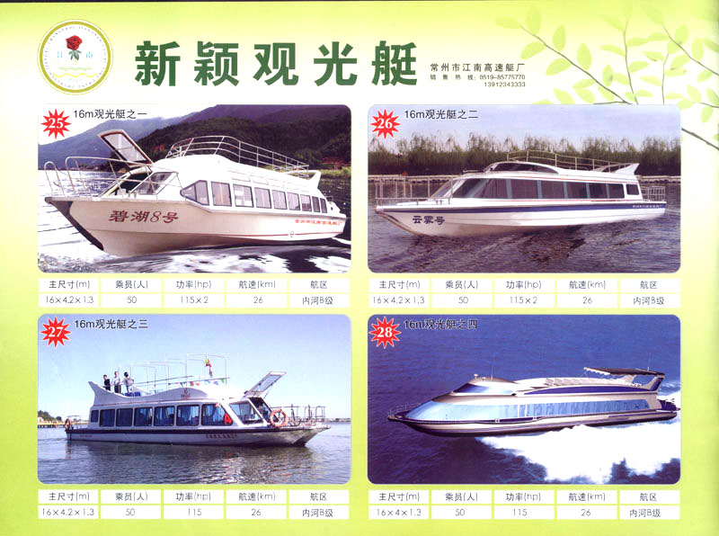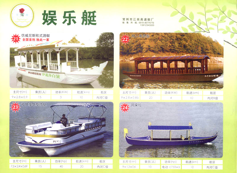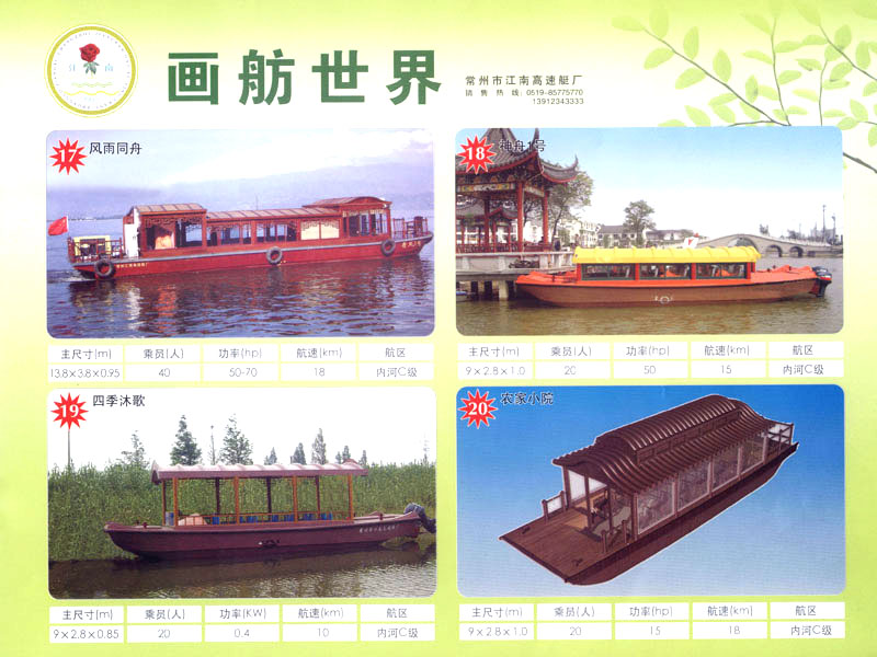隨著人民生活的提高和水上旅游業(yè)的不斷發(fā)展,原有的游艇已遠不能滿足人民群眾不斷提高的需求。為適應水上旅游業(yè)市場的變 化,我廠開發(fā)研制了符合中國國情、具有民族特色的仿古畫舫游艇及國際最新流行款式一城市旅游休閑觀光艇。特別近兩年又開發(fā)了一批精品畫舫船投放市場之后深受景區(qū)的歡迎。今年我廠又開發(fā)了適用少數(shù)民族的“風雨橋”、“寨門”畫舫艇。在湖南、廣西、云南、貴州深受愛戴。此艇別具風格,民族風情特別濃厚。侗鄉(xiāng)一號計劃在2006年5月1日投放在貴州黎平侗鄉(xiāng)風景區(qū)八舟河景區(qū)使有(風序號)。我廠歡迎用戶來圖加工,來廠考察訂貨,畫舫艇款式多多,終有一款適合你。歡迎來電來函垂詢。索樣即寄。誠心銷售、人情化服務(wù)、企業(yè)文化、精品畫舫。