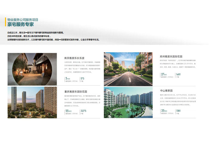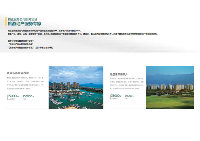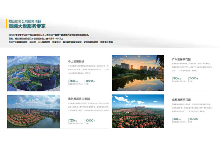 一、立足北上廣,面向全中國,走向全世界 1992年,雅居樂物業(yè)開篇中山,率先引入港式物業(yè)管理模式。1997年,依托雅居樂地產(chǎn)的崛起,連續(xù)接管中山多個項目,成為高端大盤物業(yè)管理的領(lǐng)跑者。1999年,雅居樂物業(yè)開啟專業(yè)化發(fā)展模式,全面通過英國皇家BSI的ISO9000質(zhì)量管理體系認證,2001年成為國家首批一級物業(yè)管理資質(zhì)企業(yè)。 2002年,隨著廣州雅居樂花園的盛大啟幕,雅居樂物業(yè)邁開向廣州進軍的步伐。為尋求更長遠的發(fā)展,雅居樂積極構(gòu)思上市藍圖,2005年在香港成功上市。在深耕珠三角城市群的同時,2006年雅居樂物業(yè)揮師北上,正式開啟全國部署戰(zhàn)略。2008年,接管海南清水灣項目,揭開旅游地產(chǎn)物業(yè)管理的新篇章。 接下來近十年里,雅居樂物業(yè)始終保持著最年輕的成長姿態(tài),依托“管理數(shù)字化、服務專業(yè)化、流程標準化和操作機械化”的發(fā)展戰(zhàn)略,雅居樂物業(yè)榮膺2018中國物業(yè)服務百強企業(yè)第11名,2018年中國物業(yè)服務百強企業(yè)成長性第二名、2018年中國物業(yè)服務百強服務質(zhì)量領(lǐng)先企業(yè)、2018年中國物業(yè)服務百強滿意度領(lǐng)先企業(yè)、2018中國物業(yè)服務百強經(jīng)營績效領(lǐng)先企業(yè)、旅游地產(chǎn)物業(yè)管理領(lǐng)先品牌、2018年中國辦公物業(yè)管理優(yōu)秀企業(yè)(綠地物業(yè))、2017中國物業(yè)管理企業(yè)品牌價值第12名、2017中國物業(yè)管理企業(yè)綜合實力第12名、中國藍籌物業(yè)企業(yè)、《旅游地產(chǎn)物業(yè)管理服務標準》(團體標準)起草工作等多項殊榮。 目前,雅生活集團已形成廣州、中山、深圳、南京、上海、西安、成都、海南、云南、北京、鄭州、南寧、沈陽、武漢、馬來西亞十五大城市公司全面發(fā)展的蓬勃態(tài)勢。截止2017年12月31日,雅生活集團管理范圍覆蓋全國逾69座城市與地區(qū),服務類型涵蓋主流住宅、高端豪宅、旅游地產(chǎn)、商業(yè)、寫字樓等多種業(yè)態(tài),合約總建筑面積為12610萬平方米,擁有200多個項目,服務業(yè)主逾100萬人。 2017年6月,雅生活集團收購綠地物業(yè)100%股權(quán),并與綠地集團簽署戰(zhàn)略合作協(xié)議,8月,綠地集團投資10億元獲得雅生活集團20%股權(quán)。未來,雅生活集團將實施“雅居樂物業(yè)”與“綠地物業(yè)”雙品牌驅(qū)動戰(zhàn)略,還將尋求在A股上市,力爭打造中國物業(yè)“A+H”第一股。