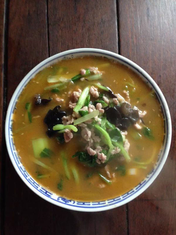 武進(jìn)區(qū)青城面館經(jīng)營(yíng)面積280平方米左右,主要特色是現(xiàn)炒肉絲,素菜蓋澆面,面館創(chuàng)始人今年63歲的王蘭珍,她對(duì)美食有著高于常人的悟性。她開(kāi)過(guò)饅頭店,開(kāi)過(guò)小飯館,承包過(guò)食堂,燒菜、取料樣樣在行,吃過(guò)的人常常贊不絕口。 20世紀(jì)初,在跟德興面館的老師傅學(xué)了做面手藝后,王蘭珍萌生了開(kāi)一家面館的想法,除了可以養(yǎng)家糊口,最重要的是想讓更多人嘗嘗自己的手藝。于是,她在自己的住處擺起了幾張桌椅,面館就算正式營(yíng)業(yè)了。因?yàn)榧易∏喑菢颍跆m珍干脆取名“青城面館”。 “從早上5點(diǎn)多開(kāi)始營(yíng)業(yè),到下午1點(diǎn)多打烊,一天至少要賣(mài)掉300多碗面,用掉近160斤面粉!睘楹吻喑敲骛^的面條如此受歡迎,兒媳婦陸偉紅說(shuō)秘訣在于湯頭和澆頭。湯頭分白湯和紅湯,白湯是由10斤豬骨頭熬制而成,湯色清澈而味道濃郁;紅湯以骨頭湯作底湯,加入茴香、甘草、草果等20多種中草藥,以及糖、醬油等調(diào)味品,鮮而不腥,散發(fā)出陣陣香味。 和一般面館事先燒制好澆頭,放在盆里供客人選擇不同,青城面館的澆頭都是一份份現(xiàn)炒的,特別講究食材的新鮮。就拿暢銷(xiāo)的肉絲蔬菜紅湯面來(lái)說(shuō),要先起猛火,把肉絲、木耳、蘑菇、青菜等食材放一起煸炒至香,然后澆在撈起的面條上。一碗面出來(lái),現(xiàn)炒的澆頭與面條融合,味道香郁至極。 遙觀人的早晨,醒得有些早。對(duì)很多遙觀人來(lái)說(shuō),美好的一天是從青城面館開(kāi)始的。那一碗碗現(xiàn)炒的蓋澆面,筋道爽滑、醬香味濃,溫存著他們的胃與記憶,帶來(lái)刻進(jìn)骨子里的家鄉(xiāng)味道。