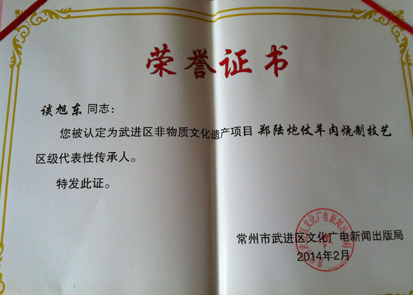 談家的羊肉館位于鄭陸老街上,深秋的一天,記者來到這家羊肉館,穿過大堂走到廚房里,幾名工人正在忙著處理羊肉。余菊華穿著大紅色的薄毛衣,坐在桌子旁,正在麻利地剔著羊肉上的肥油。她是羊肉館的老一代老板娘,如今和老伴談仲興一起,仍天天來店里幫著兒子談旭東打下手。余阿姨隨手拿過一塊長方形的肉皮,用一把小刮刀撳在上面,輕輕地刮著,一團團白白的油被剔了下來,堆在一邊!拔壹业难蛉馀酶蓛舻,腿上的肥肉還有筋筋拉拉的東西,全都要弄掉,就是自己家買了豬肉燒紅燒肉,也不可能弄到這么干凈的,F(xiàn)在的客人都怕胖,所以一定要處理得干干凈凈!庇喟⒁陶f。剔好的肉皮是用來熬成皮凍然后混和著羊肉壓制成羊糕的,只有清理得干凈,沒有一點雜質(zhì),羊糕的質(zhì)量才會好。