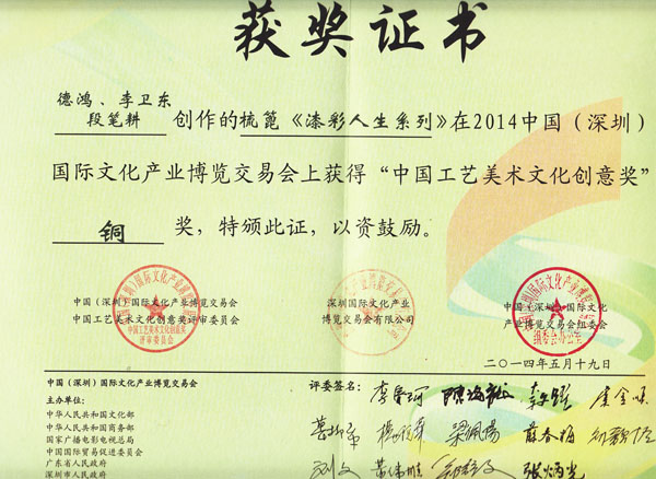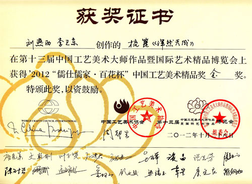 公司榮譽(yù)介紹: “2009年常州市旅游商品創(chuàng)新設(shè)計(jì)大賽”,“覽盡千荷”綠檀雕刻梳榮獲三等獎; “2011年常州市旅游商品創(chuàng)新設(shè)計(jì)大賽”,“彩印工藝梳-我們的年代(80)”榮獲二等獎。 “2011年中國包裝創(chuàng)意設(shè)計(jì)大賽“,虞美人彩印梳篦系列包裝獲得一等獎; “2011年中國包裝創(chuàng)意設(shè)計(jì)大賽”,虞美人筷子系列包裝獲得三等獎; “2011創(chuàng)意中國.第五屆設(shè)計(jì)藝術(shù)大獎賽”,虞美人系列包裝獲得三等獎; “2011首屆中國(無錫)國際文化藝術(shù)博覽會”,漆藝對梳《喜玫瑰》獲得“藝博杯“銅獎。 “第十三屆中國工藝美術(shù)大師作品暨國際藝術(shù)精品博覽會”, 漆藝梳《報喜鳥》榮獲2012“儒士儒家•百花杯”中國工藝美術(shù)精品獎優(yōu)秀獎 “第十三屆中國工藝美術(shù)大師作品暨國際藝術(shù)精品博覽會”, 虞美人《渾然天成》榮獲2012“儒士儒家•百花杯”中國工藝美術(shù)精品獎金獎 “2012江蘇省工藝美術(shù)精品大獎賽”,虞美人《S型梳》喜獲“藝博杯”銀獎 “第十四屆中國工藝美術(shù)大師作品暨國際藝術(shù)精品博覽會”, 虞美人工藝梳《新型十二星座梳》榮獲2013“國信•百花杯”中國工藝美術(shù)精品獎優(yōu)秀獎 “2013【藝博杯】江蘇省工藝美術(shù)精品大獎賽”,虞美人《萬事如意系列》喜獲“藝博杯”銀獎 “2013江蘇省工藝美術(shù)新人新作成果展作品大獎賽”,虞美人《壺(福)的藝術(shù)》喜獲“藝博杯”入圍獎 2013年度江蘇省“蘇商領(lǐng)袖峰會”,常州市卓尚飾品有限公司榮獲最具成長性企業(yè)獎 常州市卓尚飾品(虞美人)有限公司總經(jīng)理李衛(wèi)東榮獲“常州創(chuàng)意產(chǎn)業(yè)協(xié)會2013年底慈善獎榮譽(yù)” 常州市卓尚飾品有限公司榮獲薛家鎮(zhèn)人民政府2013年度“創(chuàng)新創(chuàng)優(yōu)”獎 常州市卓尚飾品有限公司榮獲薛家鎮(zhèn)人民政府2013年度“銷售業(yè)績”獎 2014中國(深圳)國際文化產(chǎn)業(yè)博覽交易會,劉燕西、李衛(wèi)東、段筆耕<十二星座系列>獲得“中國工藝美術(shù)文化創(chuàng)意獎”銀獎 2014中國(深圳)國際文化產(chǎn)業(yè)博覽交易會,徐德鴻、李衛(wèi)東、段筆耕《漆彩人生系列》獲得“中國工藝美術(shù)文化創(chuàng)意獎”銅獎 文化創(chuàng)意大獎賽“紫金獎” ,有余(魚)系列梳篦產(chǎn)品獲得了優(yōu)秀獎 2014吟飛杯首屆常州文化創(chuàng)意和設(shè)計(jì)大賽,虞美人有余(魚)系列梳篦產(chǎn)品榮獲優(yōu)秀設(shè)計(jì)獎 2014吟飛杯首屆常州文化創(chuàng)意和設(shè)計(jì)大賽,虞美人“云,月”系列梳篦產(chǎn)品榮獲優(yōu)秀設(shè)計(jì)獎 2014藝博杯江蘇省工藝美術(shù)精品大獎賽,虞美人《梳篦:酒醉的探戈》喜獲銀獎 2014“中國原創(chuàng)•百花杯”中國工藝美術(shù)精品大獎賽,虞美人《梳篦-江南風(fēng)韻系列》喜獲銀獎 常州市卓尚飾品有限公司獲“2014年常州市電子商務(wù)協(xié)會2014年度優(yōu)秀會員單位” 2014“虞美人”成為常州市知名商標(biāo)。