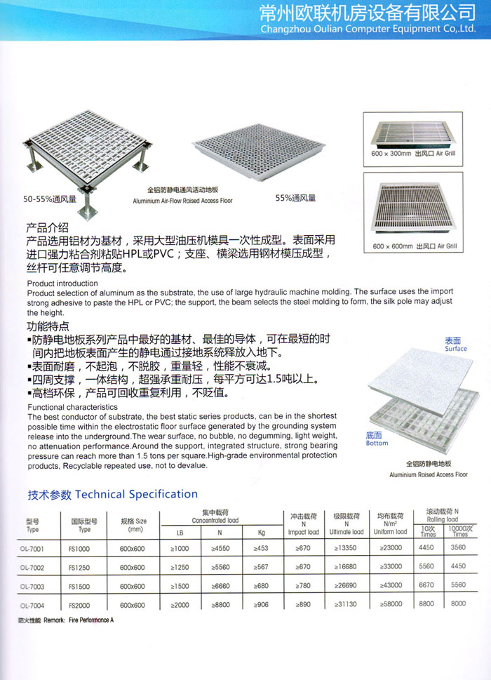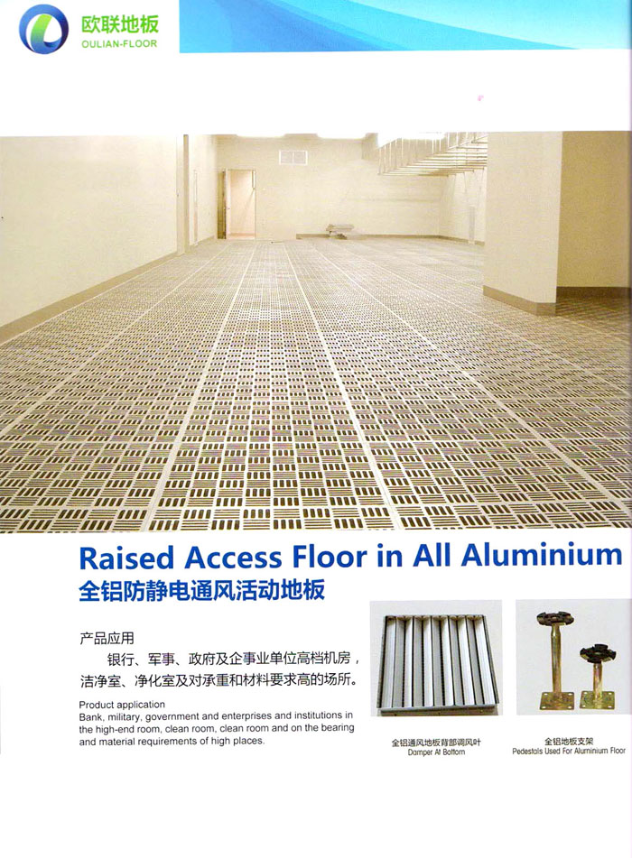 防靜電高架活動(dòng)地板、全鋼地板、陶瓷地板是計(jì)算機(jī)行業(yè)發(fā)展起來的新型鋪地材料,隔離了潮氣、靜電灰塵,最重要的是解決了綜合布線問題,無需預(yù)埋管線,可隨時(shí)拆卸、搬移,保證了資訊設(shè)備完整的優(yōu)點(diǎn),適應(yīng)了智能化樓宇中信息自動(dòng)化技術(shù)對(duì)所處環(huán)境的特定要求,避免了廣大客戶的雙重投資,使現(xiàn)代化辦公程度更加高效,辦公場(chǎng)所更加舒適。 “歐聯(lián)”系列全鋼地板,符合國家安全要求,種類完備多樣,其中防靜電陶瓷地板、硫酸鈣地板等除具有普通瓷質(zhì)的裝飾和實(shí)用性外,其耐磨、防水、防火功能優(yōu)于其它同類產(chǎn)品,防靜電系列地板,能切合不同客戶的要求,其靈活的配置,深受客戶歡迎,不同材質(zhì)的地板結(jié)構(gòu)使設(shè)計(jì)師的設(shè)計(jì)空間比傳統(tǒng)的更加廣闊自由和善變。 公司大力發(fā)展國內(nèi)外銷售業(yè)務(wù),多次中標(biāo)國內(nèi)重點(diǎn)工程 ,例:哈爾濱醫(yī)科大學(xué)、山東大學(xué)、上海普通機(jī)場(chǎng)等。 公司將一如既往開發(fā)和制造一流的產(chǎn)品,愿與廣大有識(shí)之士合作發(fā)展,共創(chuàng)美好未來。
